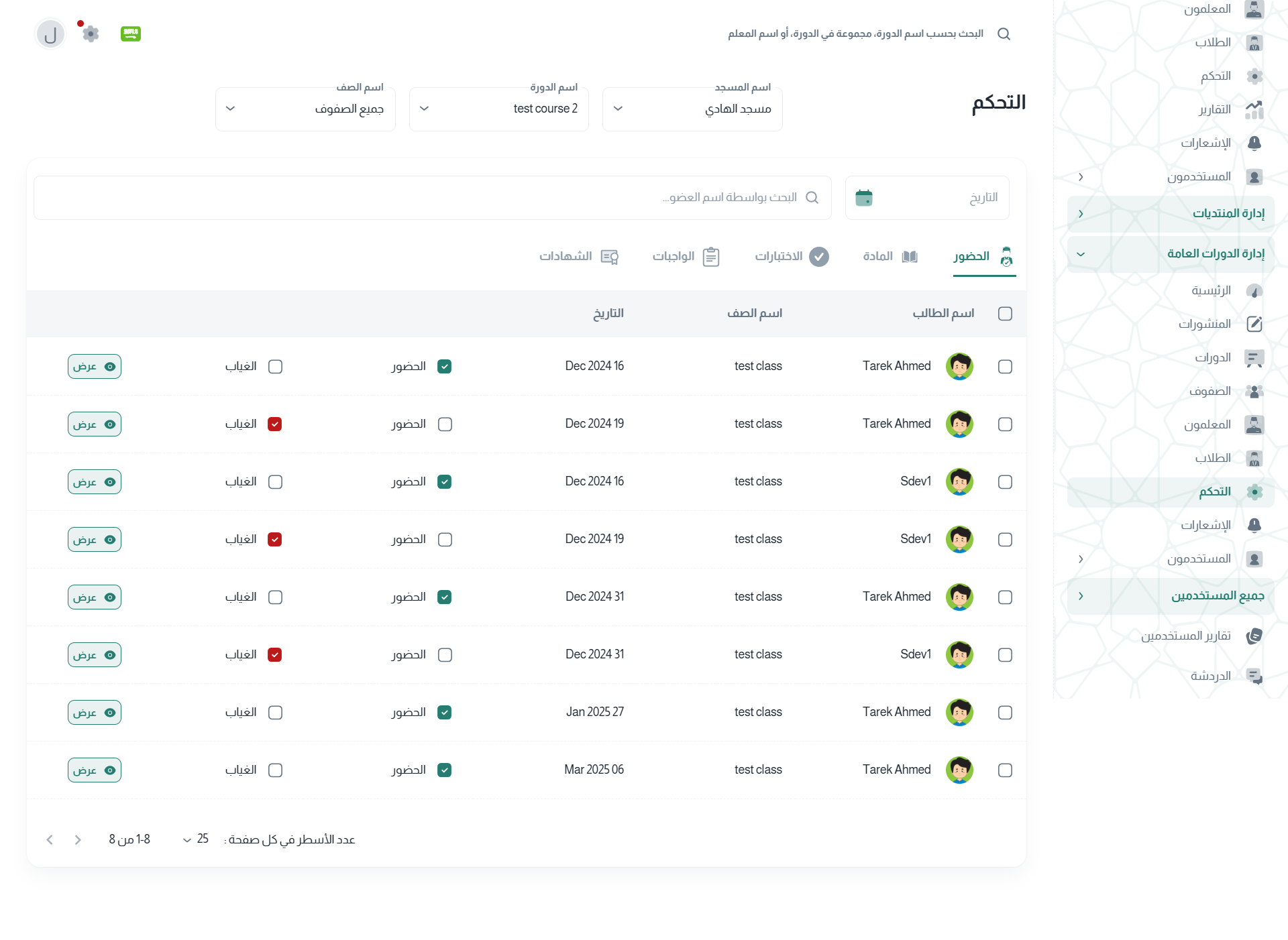 - يعرض البيانات بشكل منظم لجميع الطلاب، مع إمكانية تعديل الحالة.