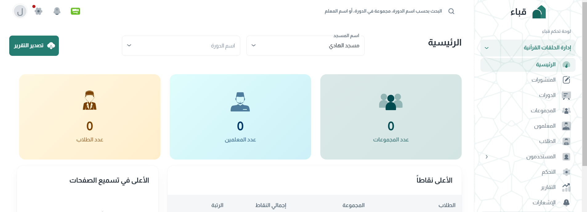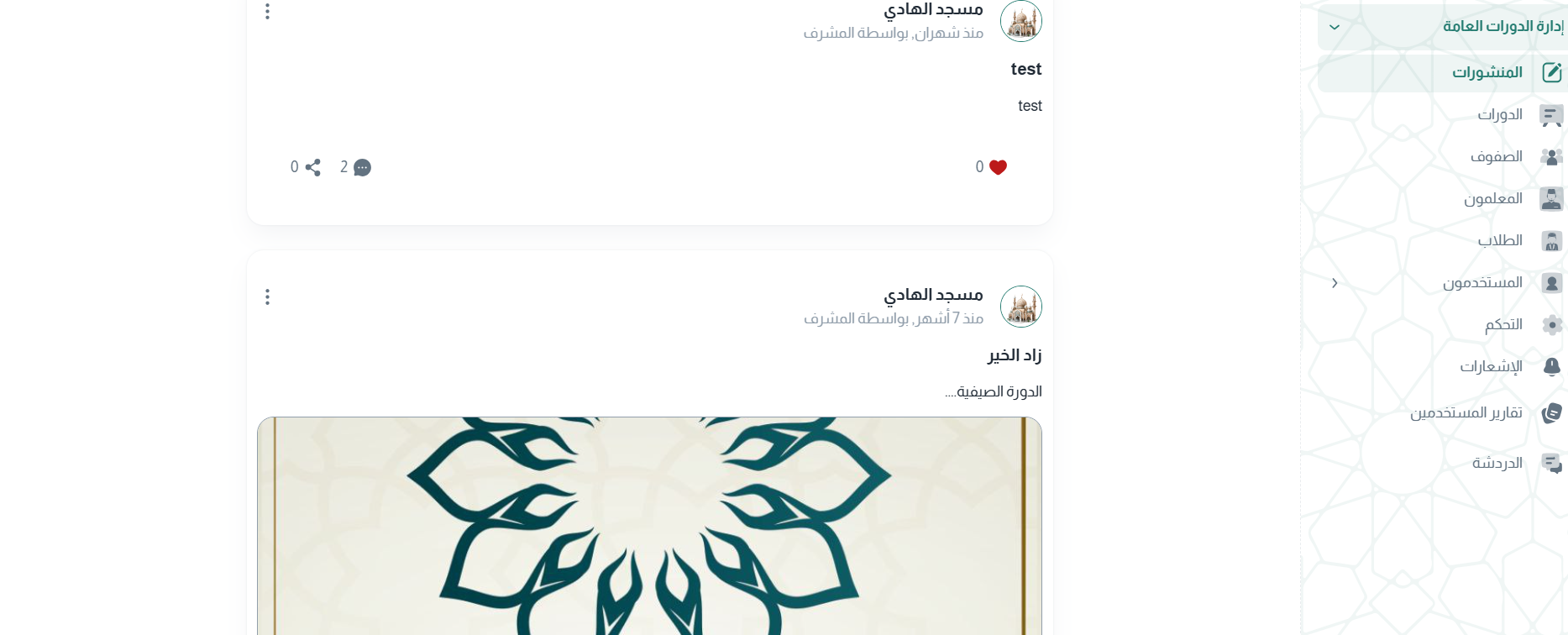 1- منشورات 2- الدورات 3- الصفوف 4- المعلمون 5- الطلاب 6- المستخدمون 7- التحكم 8- الإشعارات
