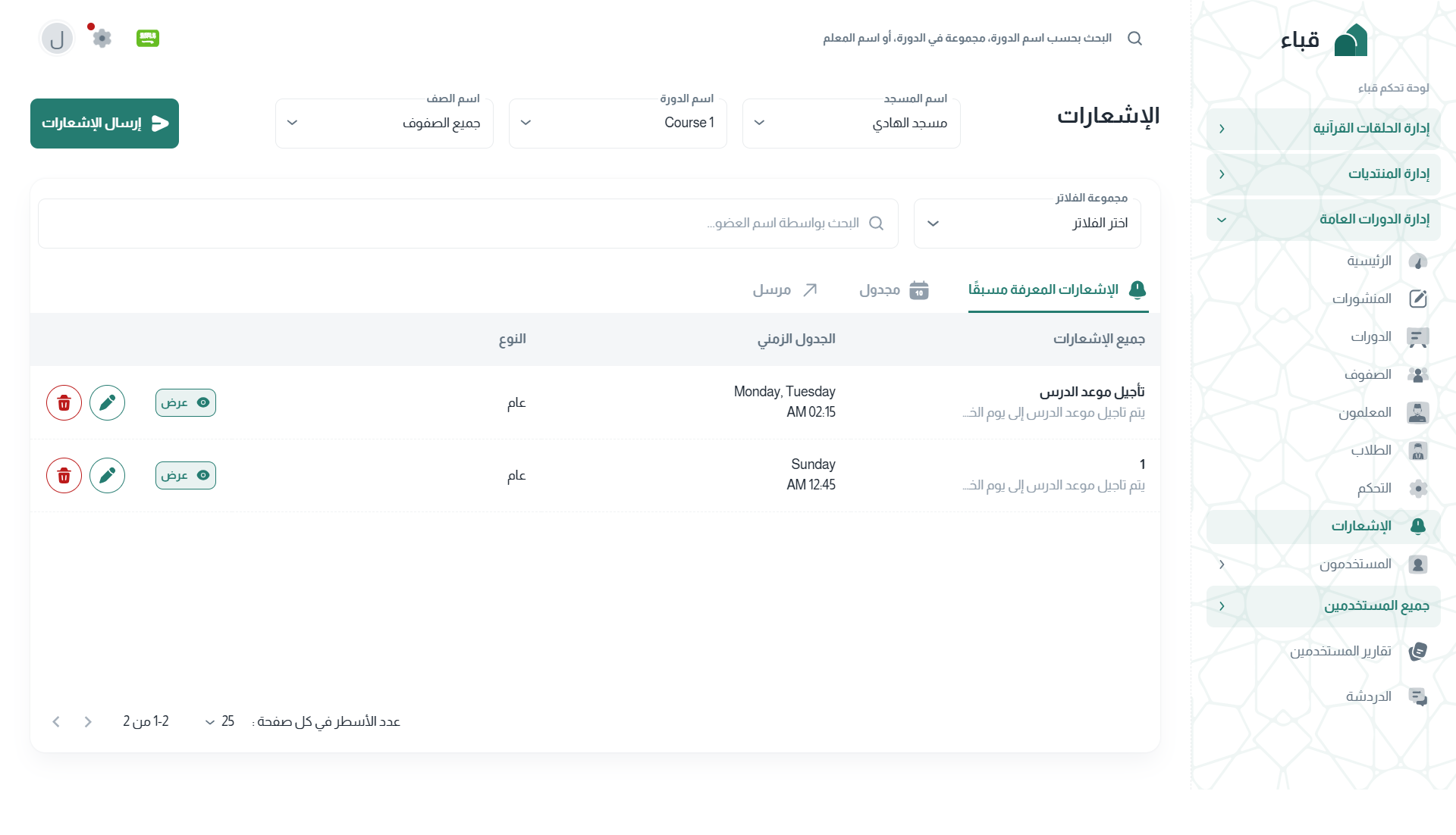• الصفحة مخصصة لإدارة الإشعارات المتعلقة بالمسجد، الدورة، الصفوف