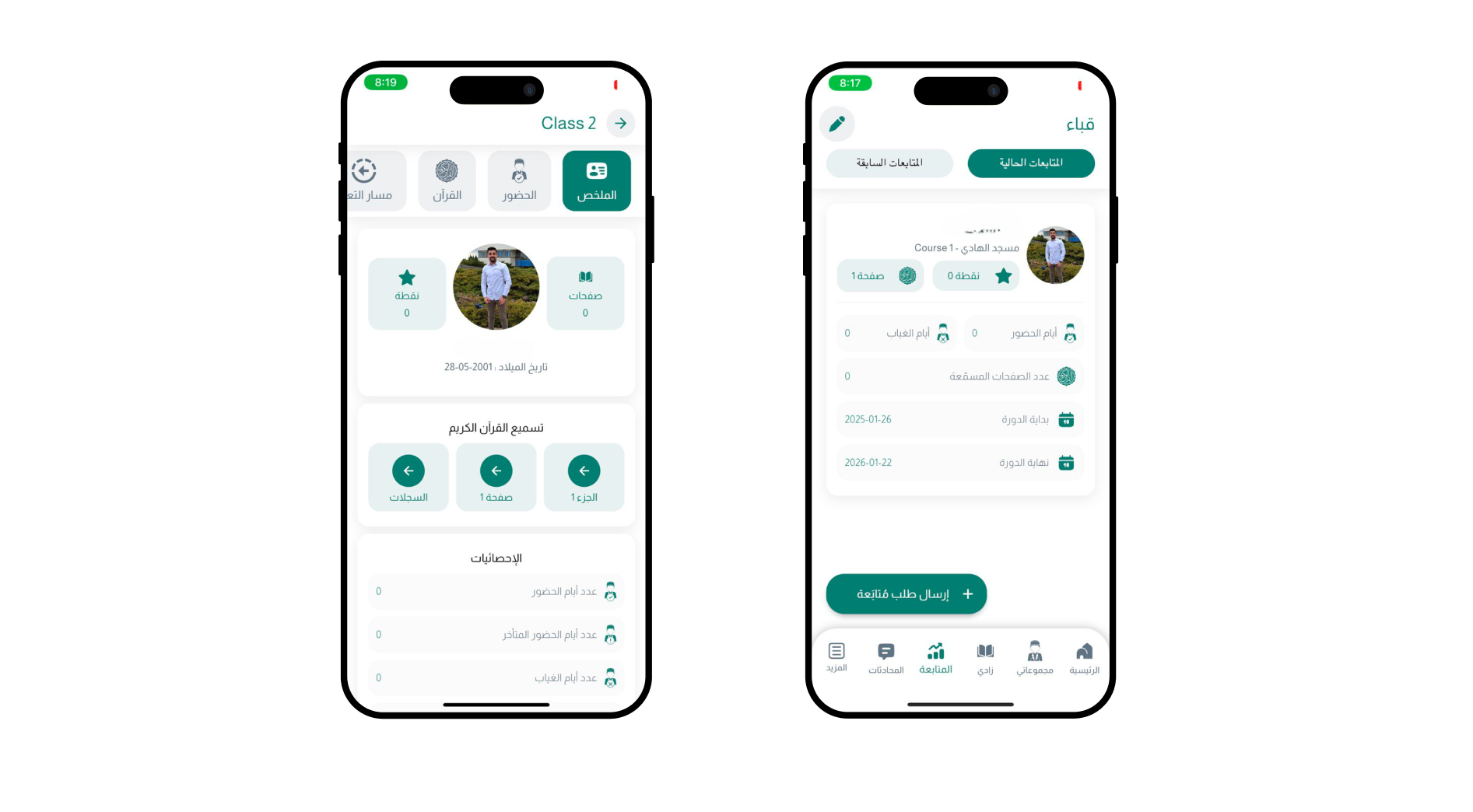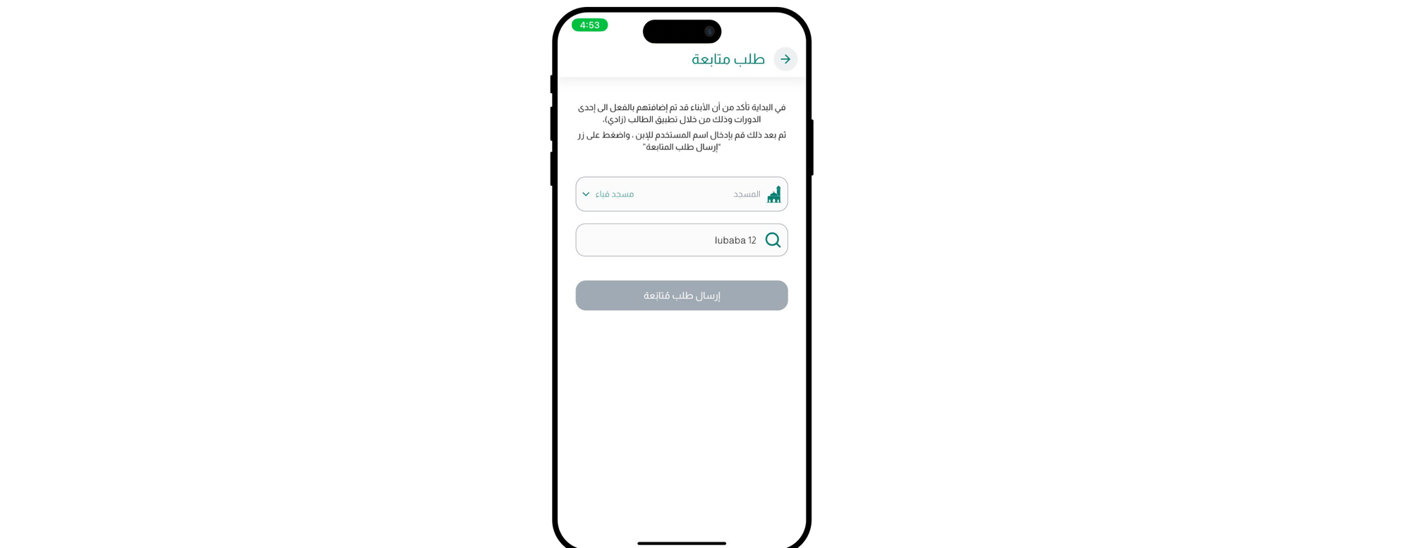 بمجرد النقر على "إرسال طلب متابعة"، يمكنك تقديم الطلب من خلال تحديد اسم المسجد واختيار اسم الطالب الذي ترغب في متابعته.